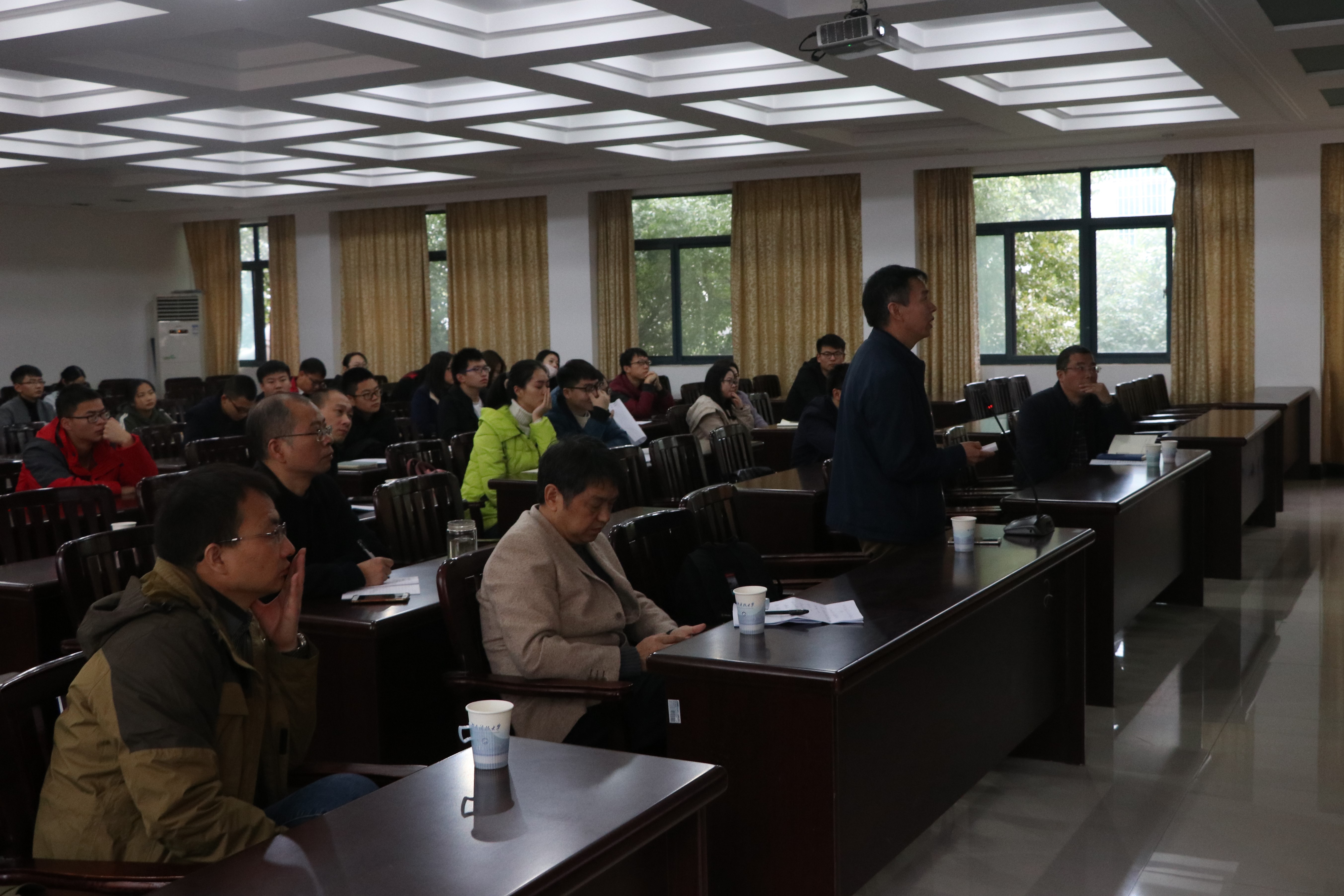 会议伊始,郝院长简要介绍了工程实践经验丰富的谢朝军和本次讲坛的主题——隧道通风设计关键技术。随后,谢朝军教授逐一阐述了“中庭地铁站防排烟策略综述”、“烟规及地铁火规对地铁防排烟设计的影响”、“地下互通立交隧道关键技术”、“管廊设计探论的几个问题”等几个方面的内容,并对其中的“公铁合建隧道通风关键技术”、“快线地铁隧道通风关键技术”、“系统工程技术-越江隧道排烟救援疏散”等问题进行细致讲解。整个讲座持续时间一个半小时,最后,郝院长对本次讲座进行了简要总结,他认为此次讲坛内容贴合实际,提出了很多同学们以后可能遇到的问题,讲座涉及到的地铁、各种隧道、管廊内容都很有用、有益。讲座结束后的提问环节中,同学们积极参与,提出自己的疑问,谢教授就“地铁站新修的挡板是否会降低活塞效力”这个重点问题进行了耐心详细地解释。
