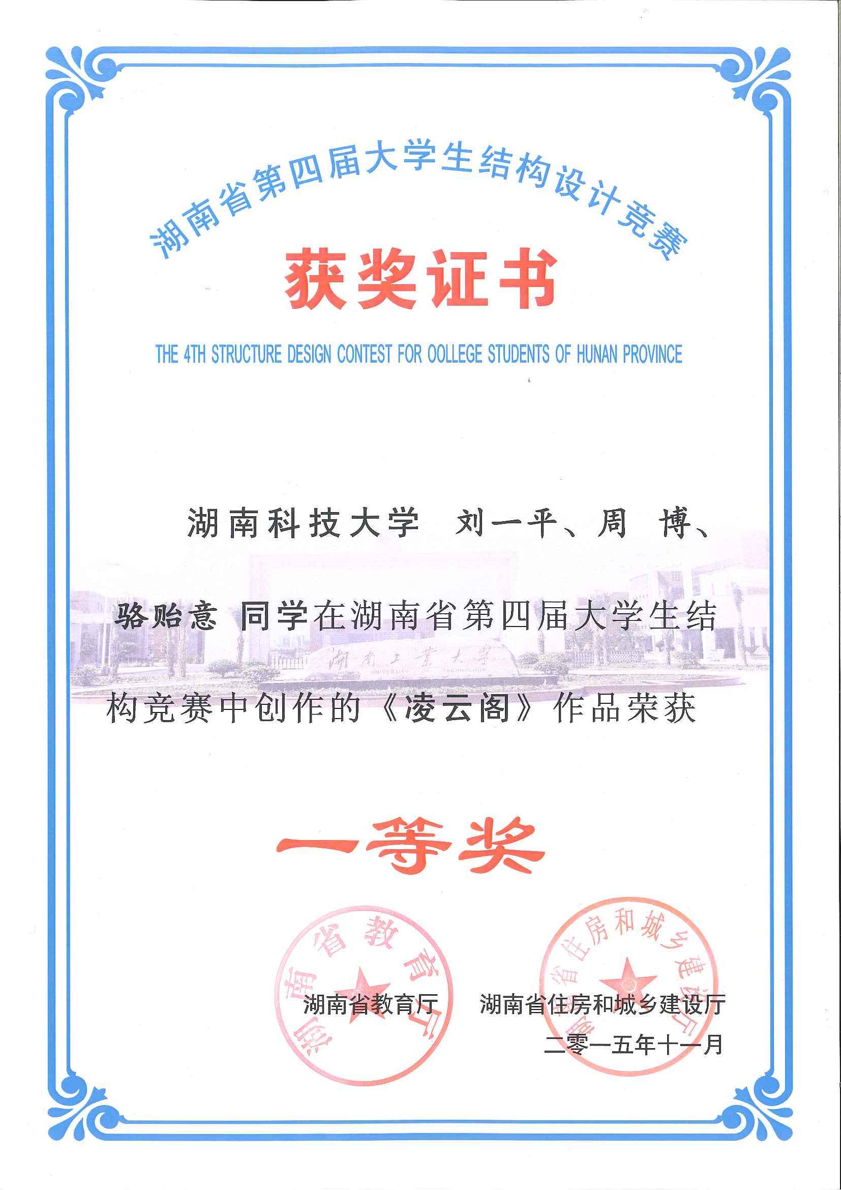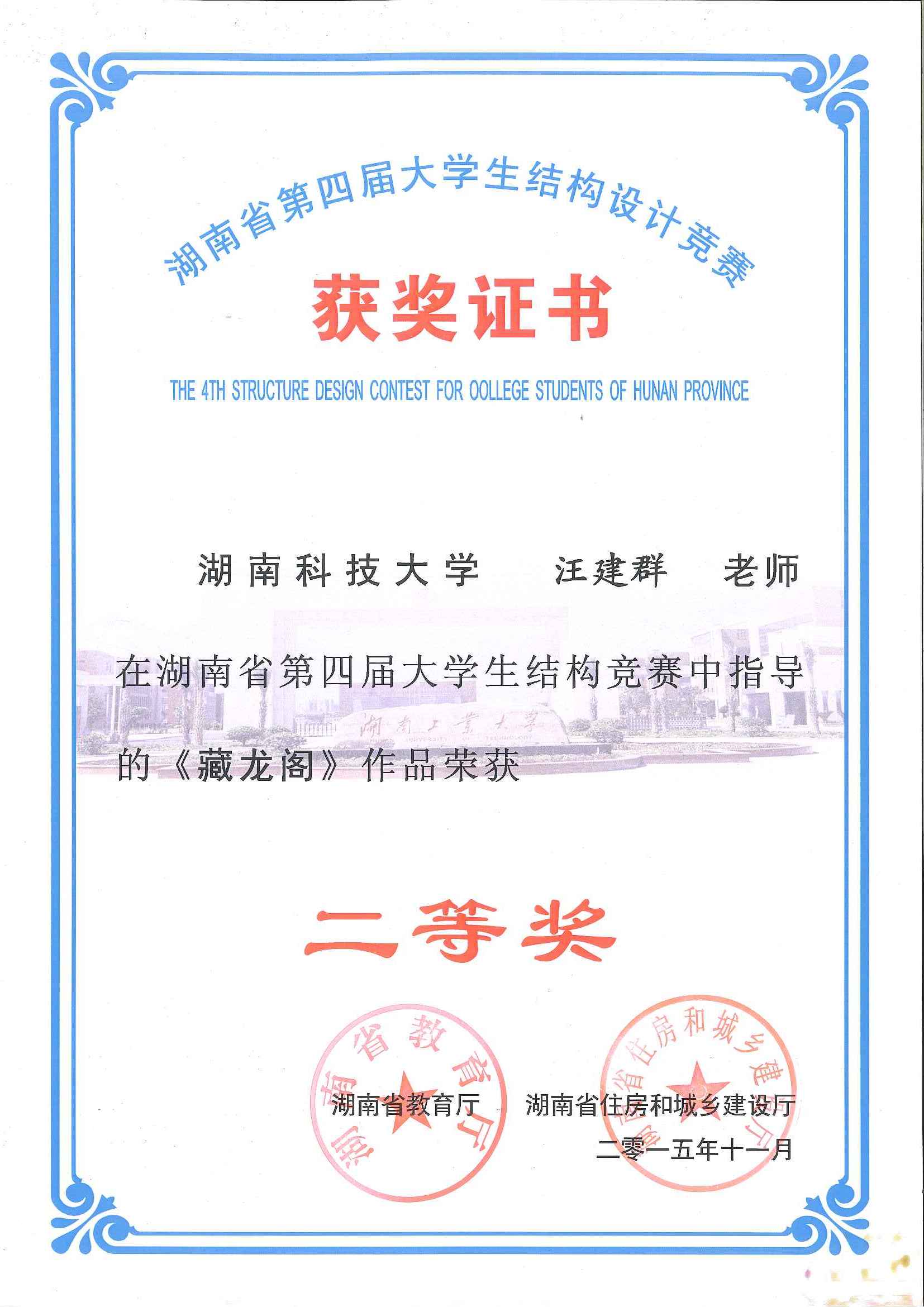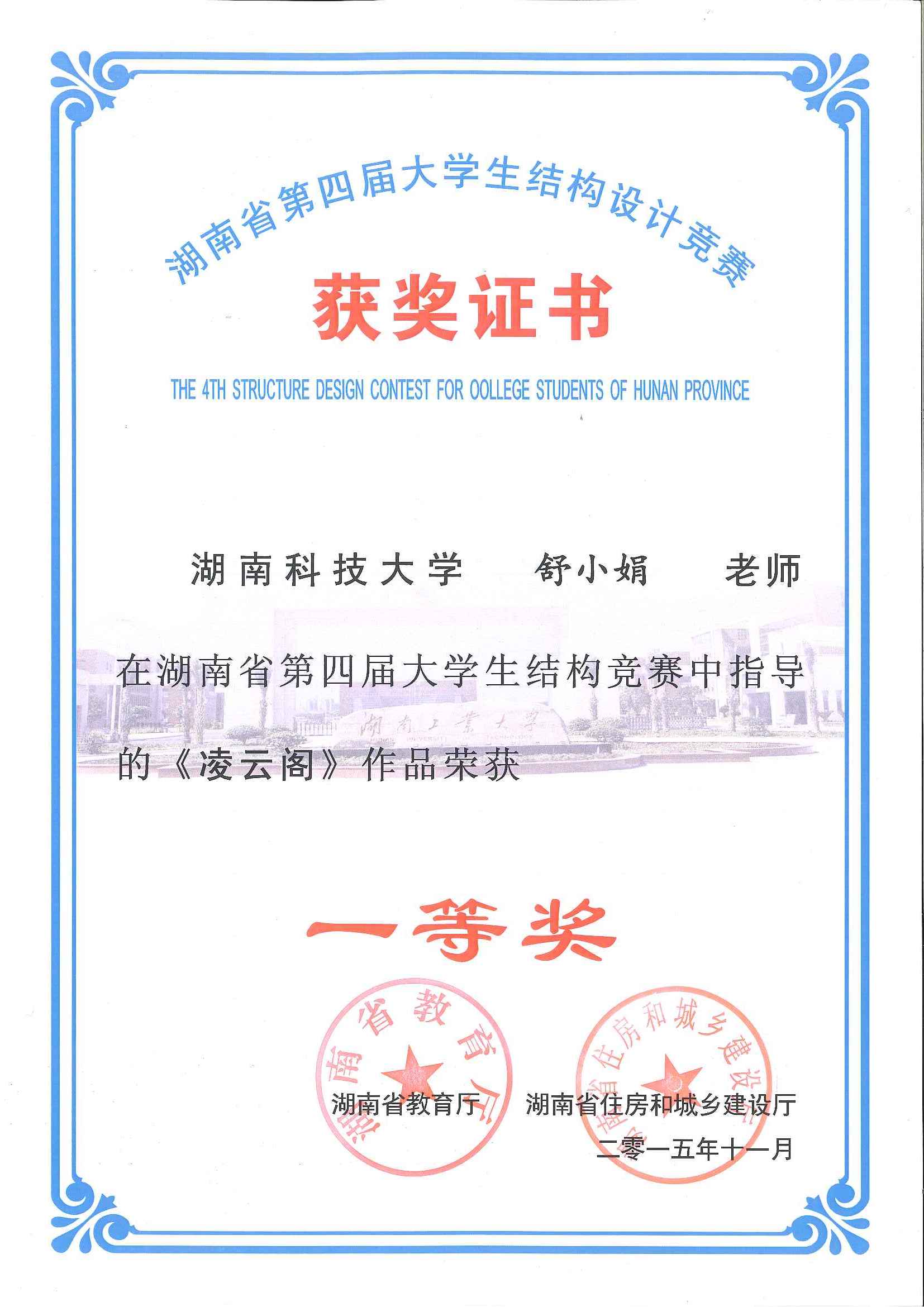 2015年11月27日至29日,湖南省第四届大学生结构设计竞赛在湖南工业大学成功举办。我校组织和选派了4支队伍参加了本次比赛,其中舒小娟老师指导的参赛队伍现场完成的名为“凌云阁”的模型获得了一等奖,由汪建群老师、禹见达老师、李永贵老师分别指导的三组学生也均荣获二等奖。本届竞赛再次展现了我校在湖南省大学生结构设计竞赛中处于领先的水平。