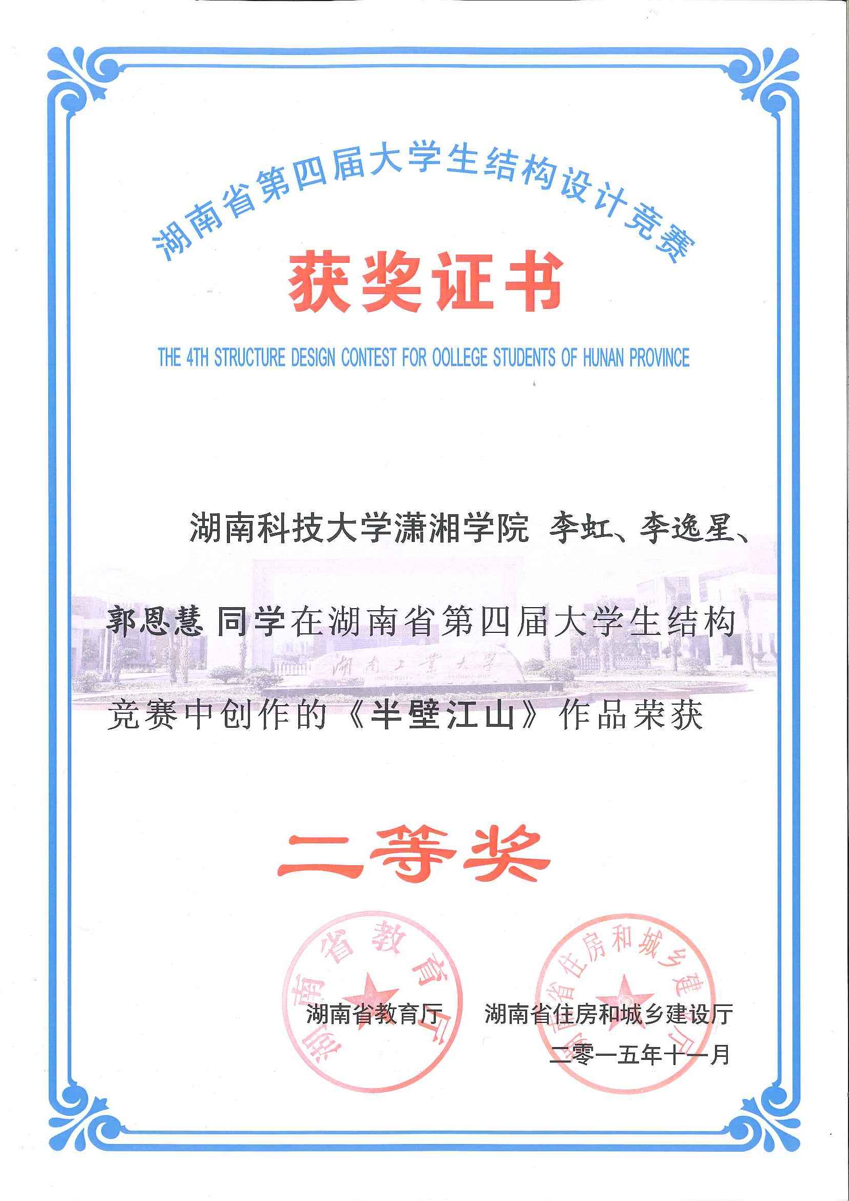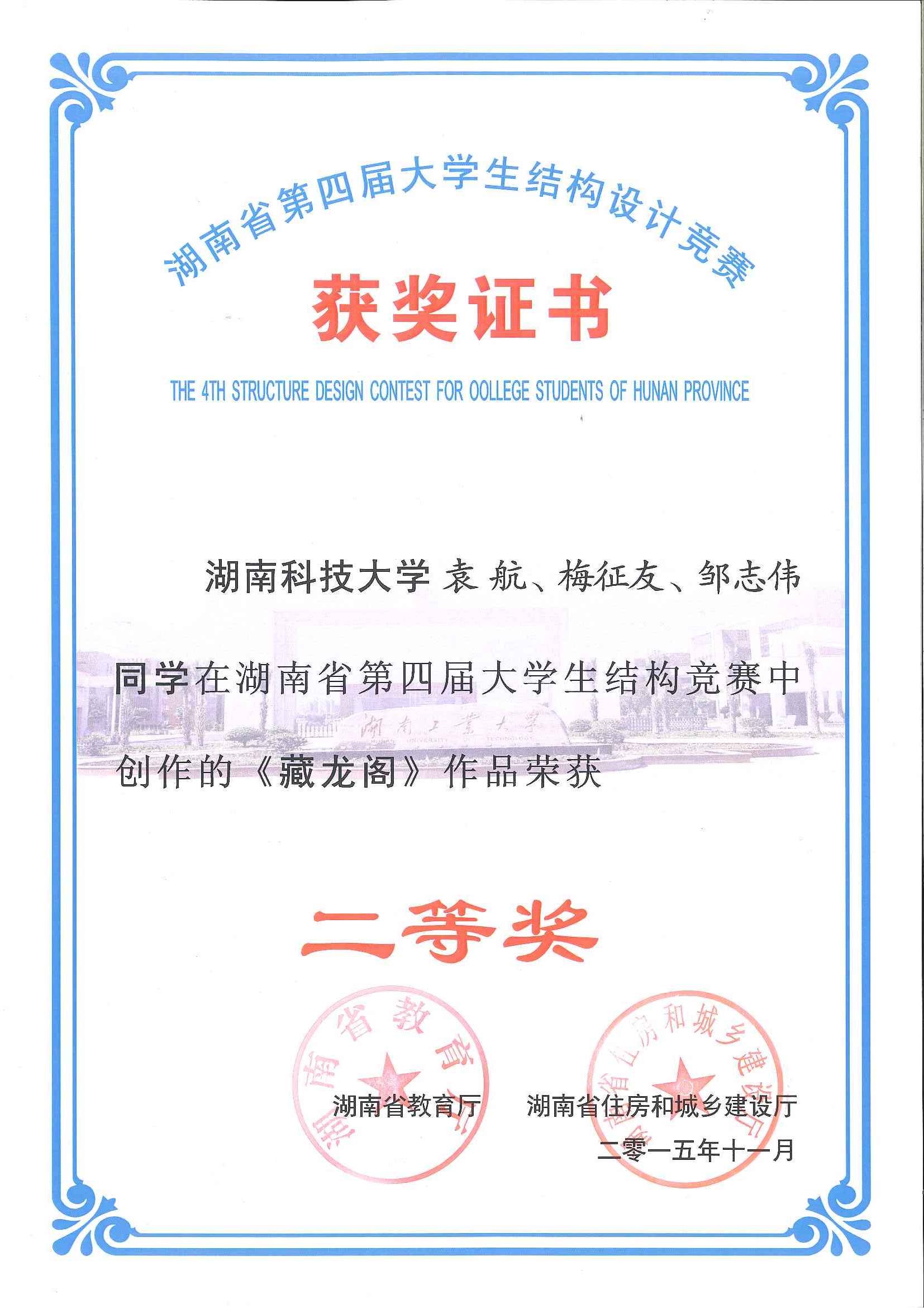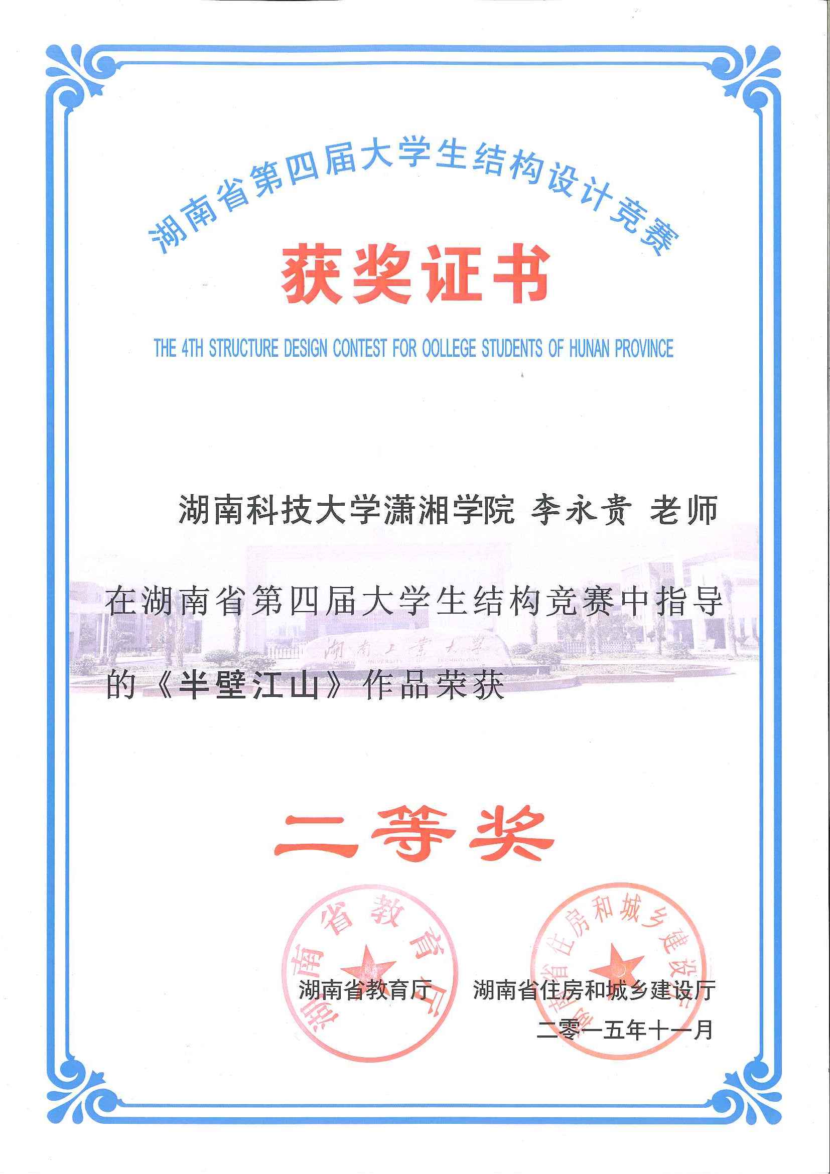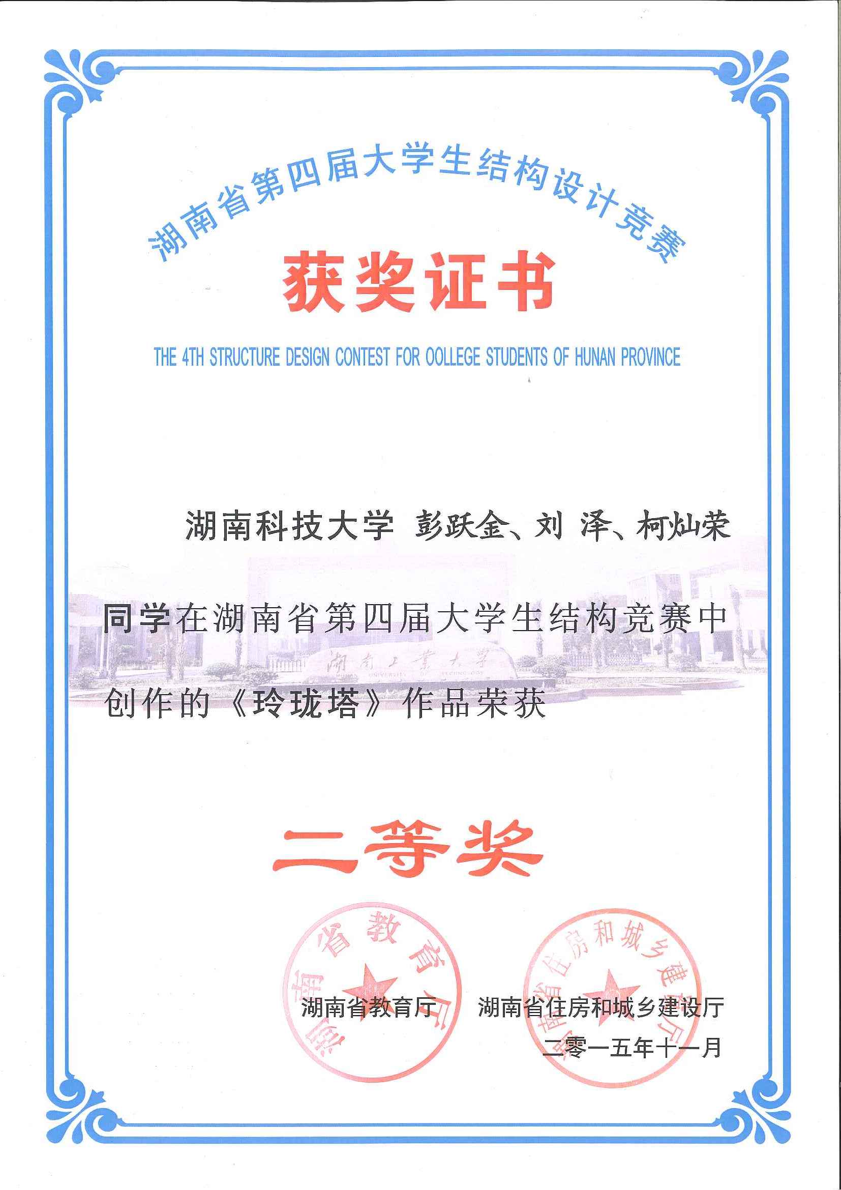 2015年11月27日至29日,湖南省第四届大学生结构设计竞赛在湖南工业大学成功举办。我校组织和选派了4支队伍参加了本次比赛,其中舒小娟老师指导的参赛队伍现场完成的名为“凌云阁”的模型获得了一等奖,由汪建群老师、禹见达老师、李永贵老师分别指导的三组学生也均荣获二等奖。本届竞赛再次展现了我校在湖南省大学生结构设计竞赛中处于领先的水平。