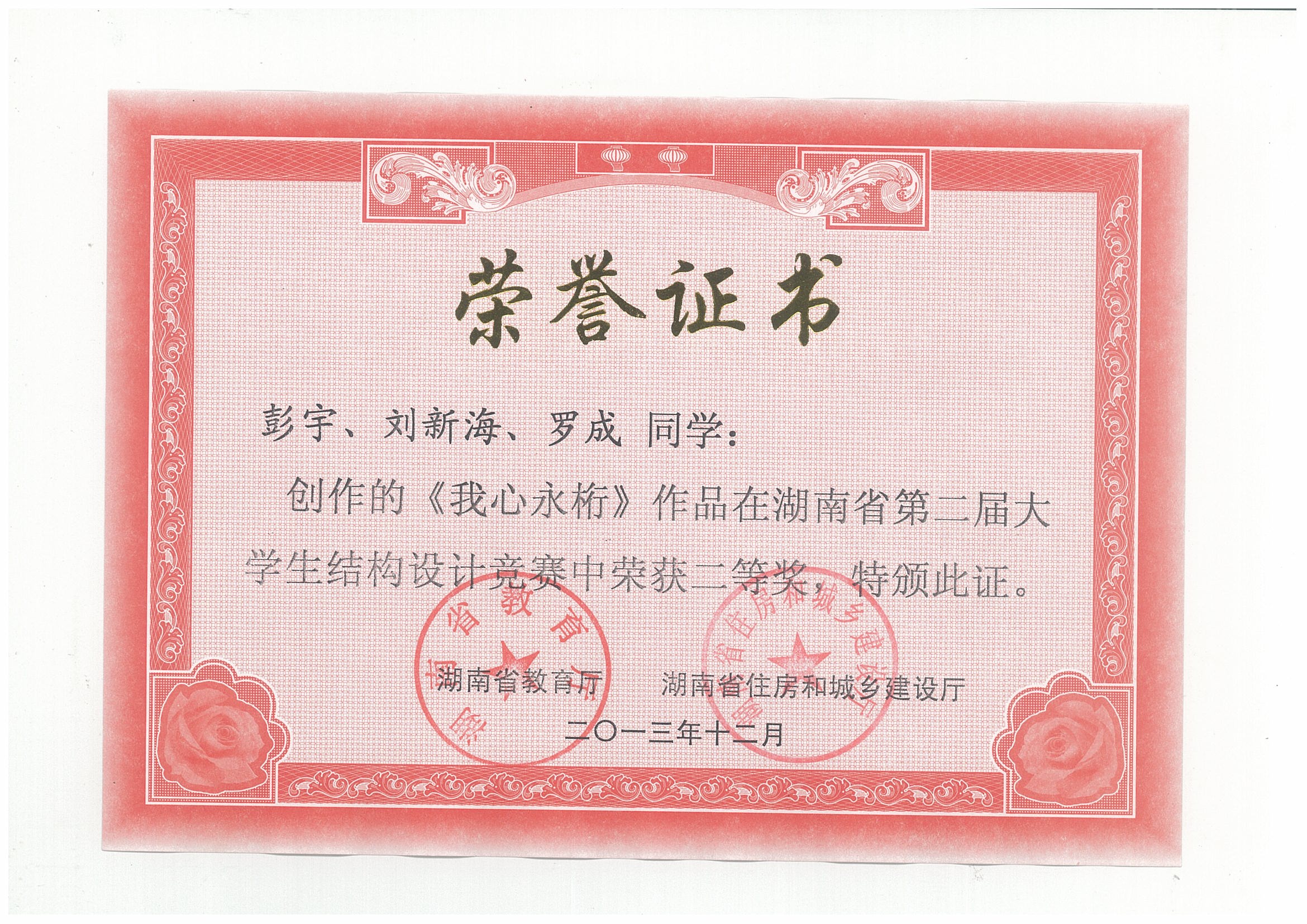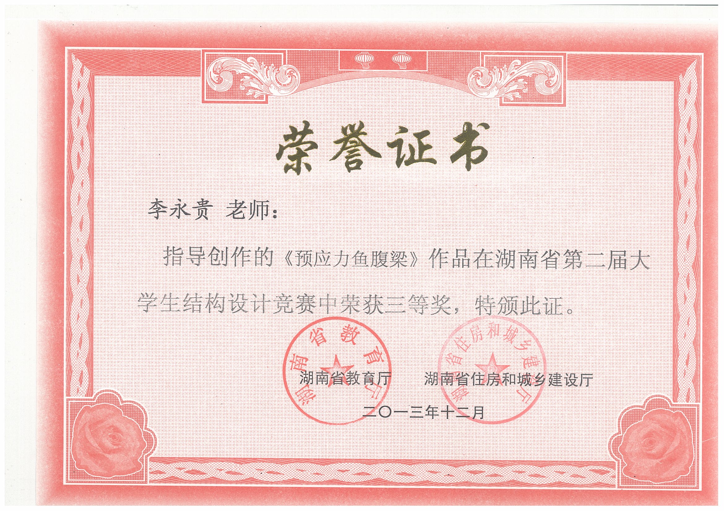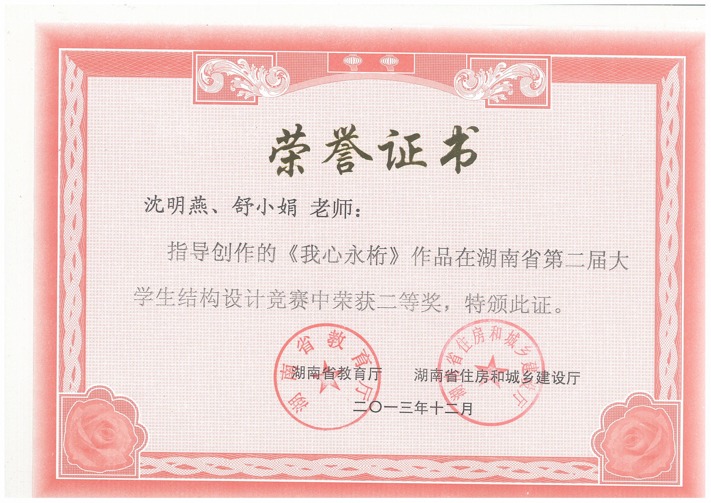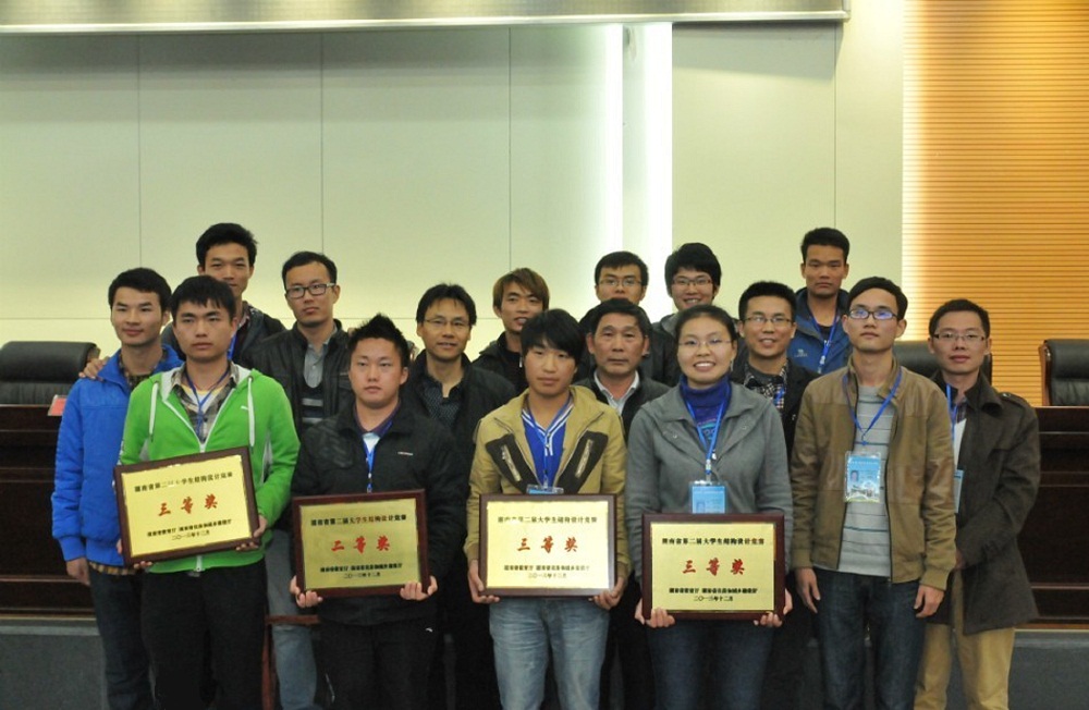 湖南省第二届大学生结构设计竞赛于2013年12月6日至9日在湖南城市学院举行,共56支参赛队伍参加了本届竞赛。我校组织和选派了4支队伍参加了本次比赛,最终沈明燕和舒小娟两位老师共同指导的参赛作品“我心永桁”荣获二等奖,黄海林、汪建群、李永贵等三位老师指导的作品也均荣获三等奖,团体总成绩进入本届赛事的全省前四,实现了大学生结构设计竞赛相关建设的飞跃式发展。