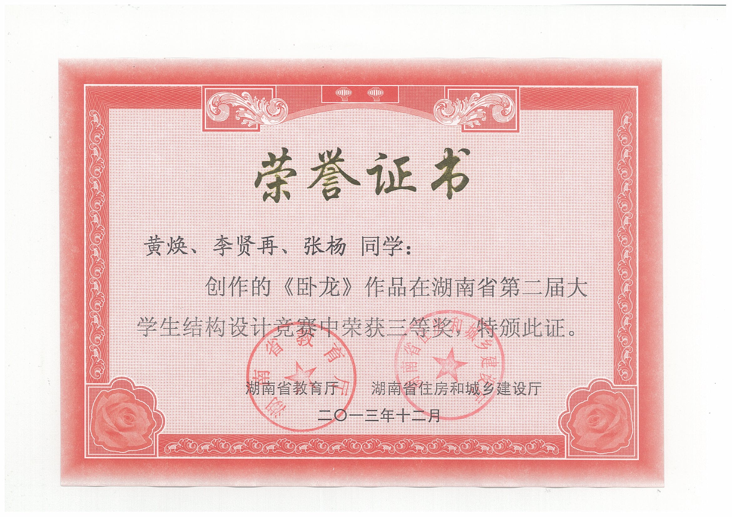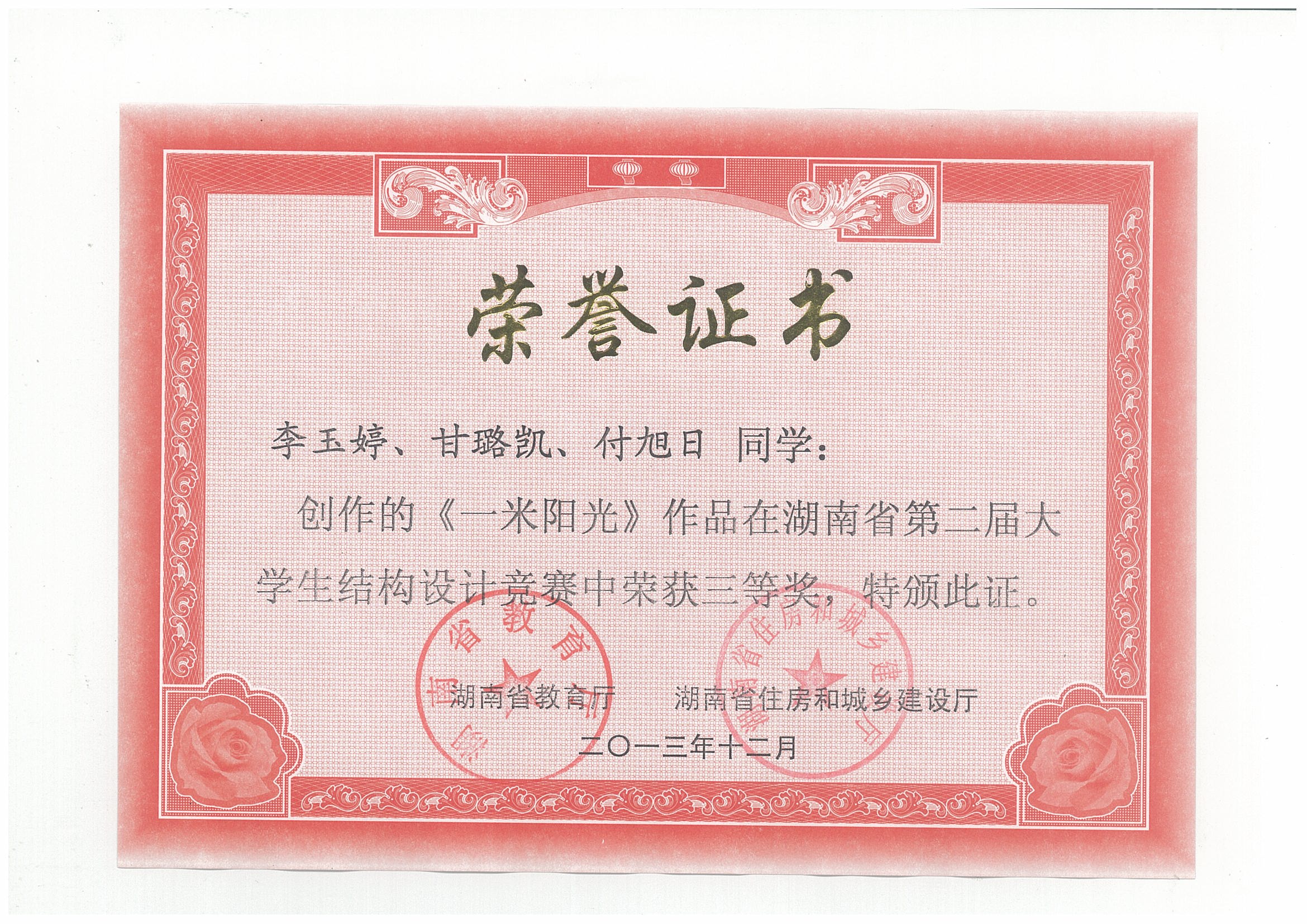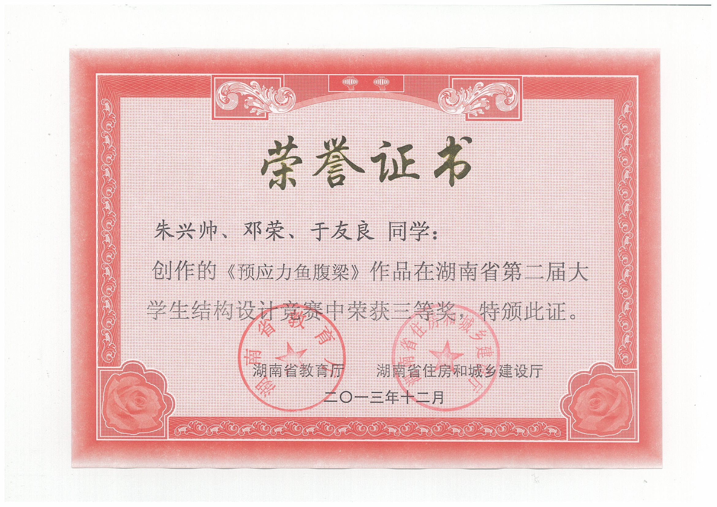 湖南省第二届大学生结构设计竞赛于2013年12月6日至9日在湖南城市学院举行,共56支参赛队伍参加了本届竞赛。我校组织和选派了4支队伍参加了本次比赛,最终沈明燕和舒小娟两位老师共同指导的参赛作品“我心永桁”荣获二等奖,黄海林、汪建群、李永贵等三位老师指导的作品也均荣获三等奖,团体总成绩进入本届赛事的全省前四,实现了大学生结构设计竞赛相关建设的飞跃式发展。