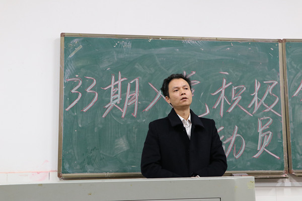 会议由我院党建办副主任谢林开场,他强调了上课的要求、请假注意事项、听课座位、成绩评分规则、交通安全等注意事项,希望入党积极分子做到学会学习和学会奉献。随后,虢利钢老师从学生工作、学生思想状态和学生党员发展三个方面进行了发言。虢老师在发言中指出:“入党是一个终身课题,是人永恒的追求。经过33期的沉淀,党支部已成为学生中拥有优良传统的中坚力量,希望同学们在加入后能够进一步活跃党支部。”虢老师用自己的言语表达了对同学们的美好期盼,希望同学们有更高更大的人生理想。接着,我院党建办副主任祝海军对虢老师的发言进行了简练精确的总结,就入党动机和党员责任两方面进行了详细发言。最后,院党建办副主任朱开宁强调了同学们的学习态度并修正了一些错误认知,希望入党积极分子都能够端正学习态度,积极向党组织靠拢。