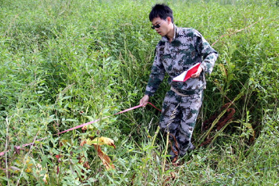 湖南省永州市新田县火里塘村是湖南省国土资源厅建设重点扶贫点,该村常年严重缺水,生活用水和农业用水常年得不到保障。找水小分队通过与村官、村民的交流,对当地的情况有了初步了解,然后把附近一片废弃的农田作为第一个测试点,接着他们陆续地把天然电场选频仪、电极、电线、皮尺等测量工具带到试验田。首先队长用皮尺圈定测量范围,其他队员各自负责自己的事情,有条不紊,不到半个小时,基本工作都已经完成。最重要的是数据采集环节,在烈日下,找水小分队面朝黄土背朝天,在每个测试点都认认真真的读数和记录数据,为了避免出现错误,小分队成员都会重复做一次试验,有时因为数据的波动性较大,会重复做更多次。在两个测试点之间,小分队队员们不厌其烦地重复同样的动作,汗水渐渐地浸透了他们的衣裳。通过他们的不懈努力,百分之八十的工作在中午之前已经完成。吃过午饭,休息一段时间后,小分队4点半再次出发前往火里塘村完成剩下百分之二十的工作。