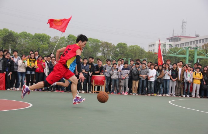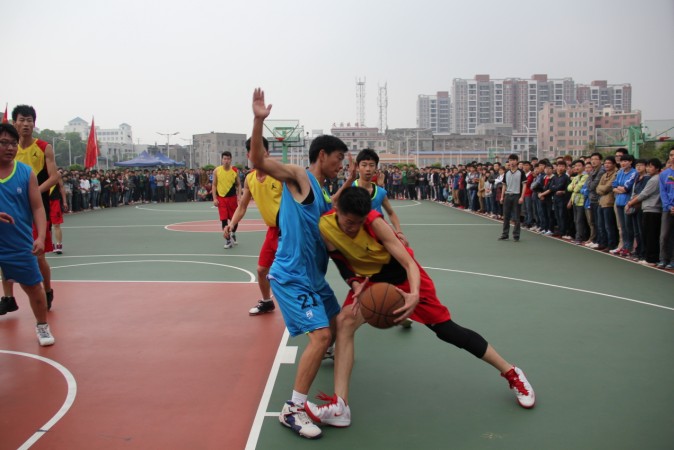 球场上红旗飘扬,擂鼓声震耳欲聋。我方队员身着红黄拼色球服、斗志高昂、摩拳擦掌、欲与对手一较高下。裁判吹响了开场的哨声,双方立马展开攻势,我院5号球员带球过人,不料对手犯规,裁判判我院球员罚球,第一个球未罚进,他没有因前面的失误而紧张,投第二个球时,他全神贯注、瞄准、抛投、进球,全场一片沸腾。紧接着建筑学院的前锋快攻上篮得到两分。比赛进行到一半,双方你来我往,比分不断攀升。我院内线防守严密,建筑学院篮球队攻不进内线,上半场,我院比分领先。
