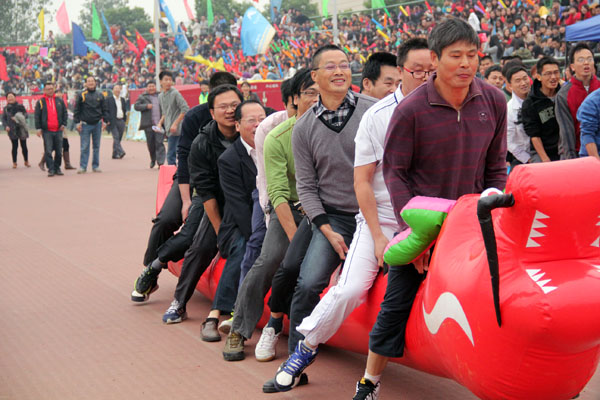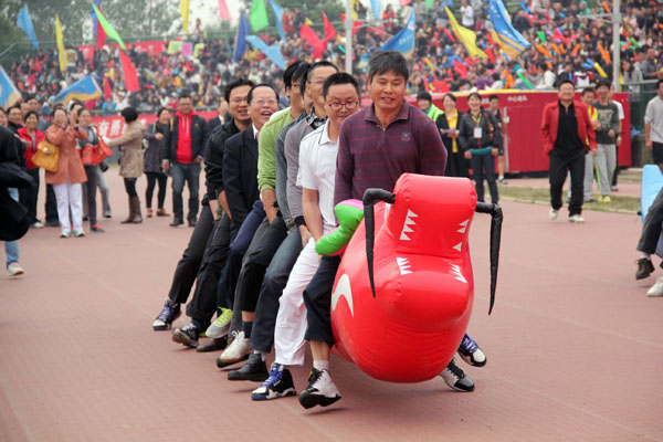 在这个初冬的季节,欢乐声依旧激情地飞扬在运动场上,在同学们的欢呼声中,老师们陆续进入了赛场。比赛开始,以学院为单位,各派出一支代表队。我院的8名老师组成一队,同心协力,手提“长龙”在赛场上飞奔,平日里的辛苦与疲惫此时都在脸上一扫而空,只存在轻松与愉快。我院13级辅导员