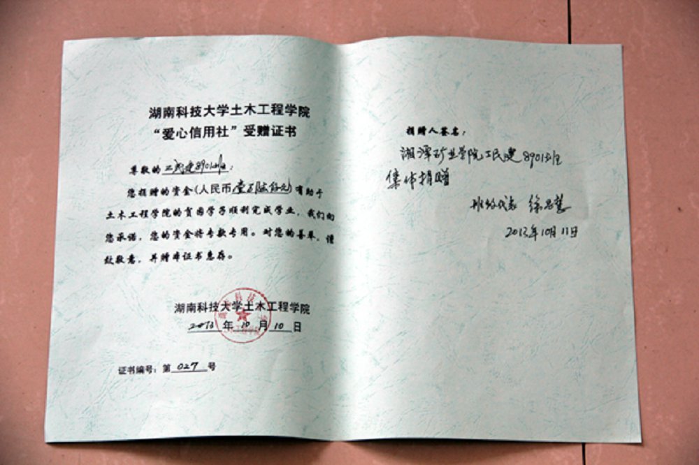 工民建专业8901班全体校友,共同捐赠壹万陆千元给我院爱心信用社,以表示对我院帮扶贫困生工作的支持,他们希望学弟学妹们努力学习,早日成才,并祝愿我院在师生的共同努力下越办越好。