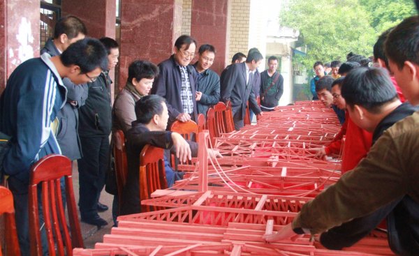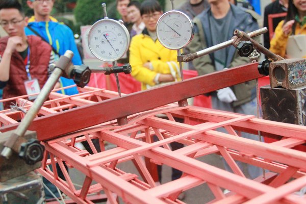 图片711月2日于湖南科技大学南校俱乐部前举办了每年一度的结构建模大赛。出席此次选拔赛的指导嘉宾有钟新谷、易贵元、虢利钢、罗芽松、曾淑艳、禹见达、刘锡军、聂忆华、舒小娟、王修勇、任伯帜、汪建群、戴益民、丁时宝、祝明桥、罗建文等。 教务处副处长罗建文宣布比赛正式开始,从评审专家刘锡军为大家讲解的大赛规则中我们了解到,模型制作的材料规格为Z1,模型的粘剂要为正规厂家生产的502胶,几何尺寸要求最大宽度为40㎝,最大高度为10㎝,长度需大于加载跨度120㎝。对一个模型的主要评价包括其自重、外观、有效荷载和变形的大小。本次比赛采用偏心加载测试(仅在模型的一侧进行加重为了更好地测试其对称性和稳定性),模型的承重能力占总成绩的百分之六十,变形程度占总成绩的百分之四十,模型材料由学校统一发配,模型全身为木制。同学们利用所学专业知识,充分发挥自己的想象力,做出了一个个精美的作品,他们的桥梁模型虽大同小异,但结构上每一个细微的差别都会是他们制胜的关键,多余的支架并不能起到加强稳定的效果反而会增加自身重量,得不偿失。所以每个模型都要经过精密的测量和计算,同时兼顾力学、结构学等专业知识来统筹制作,整个过程不仅考验了选手的的耐心、细心,更考验了他们的团队合作和动手能力。场上总能看到模型在强大压力之下不幸崩溃的场面,但也不缺乏在所有砖码都加载上后仍然 傲然挺立 的佳作,在场的人也不禁为之欢呼。聂忆华表示:通过这场比赛,同学们加深了对结构力学的认识,同时他也希望同学们可以在比赛中收获知识和快乐,并且取得好成绩! (新闻:王斌 陈治茂 尹家骁/摄影:周晨凯)