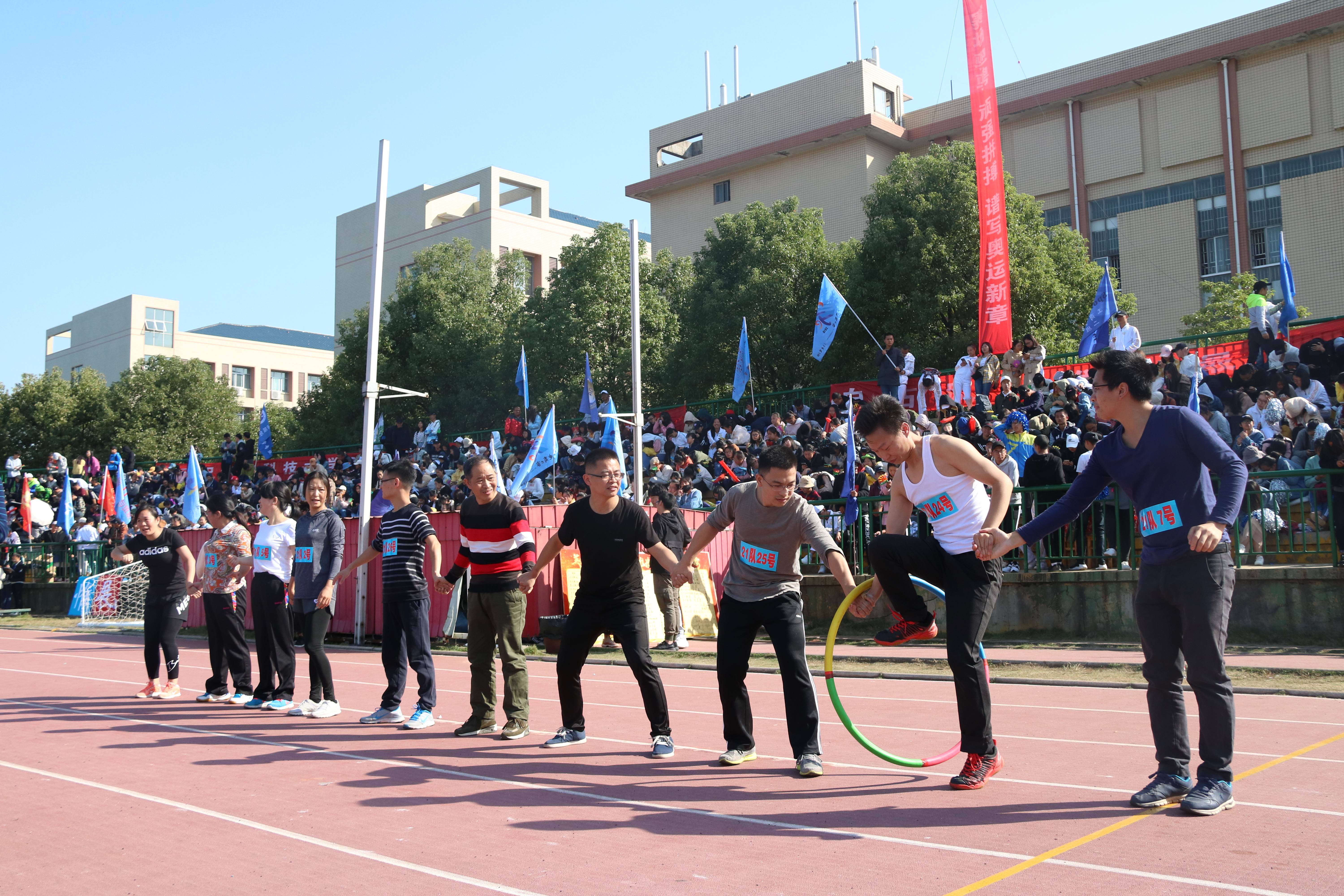 比赛场上,每一位老师都笑容满面,精力充沛,朝气蓬勃。比赛开始前,老师们排成一排,紧张而有序的进行着赛前最后几次练习。几分钟后,哨声一响,比赛正式开始。老师们都拿出最好的精神状态,全力投入,有条不紊的将呼啦圈快速传递下去。同时观众也都为老师们捏着一把汗,看到精彩的传递,忍不住鼓掌欢呼,尤其是当最后一个人举起呼啦圈的那一刻,裁判按下计时表,观众欢呼雀跃,为老师们喝彩,整个比赛过程的气氛热烈而又紧张,扣人心弦而又不失活泼。